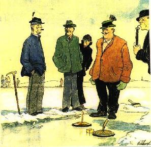 Es gibt viel Schnee in diesem Winter. Sogar der Weg zum Weiher wird ein wenig beschwerlich. Aber was tut's. Es geht auf Lichtmeß zu. Verschiedentlich scheint schon die Sonne. Der Schnee wird naß und schwer. Das Eis wird weich. Die Eisstöcke laufen nicht mehr so recht. Der Ring grabt in's Eis und bremst.